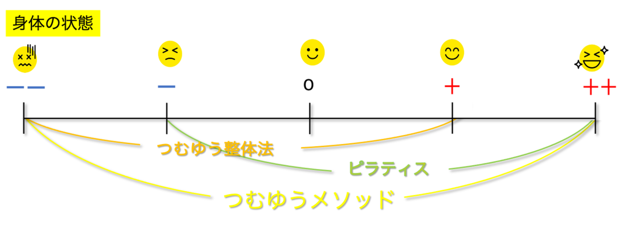 つむゆうメソッドは現在の辛い状態を「つむゆう整体法」で解消し、さらに骨格の再教育を促す「ピラティス」を掛け合わせた独自のメソッドになります。